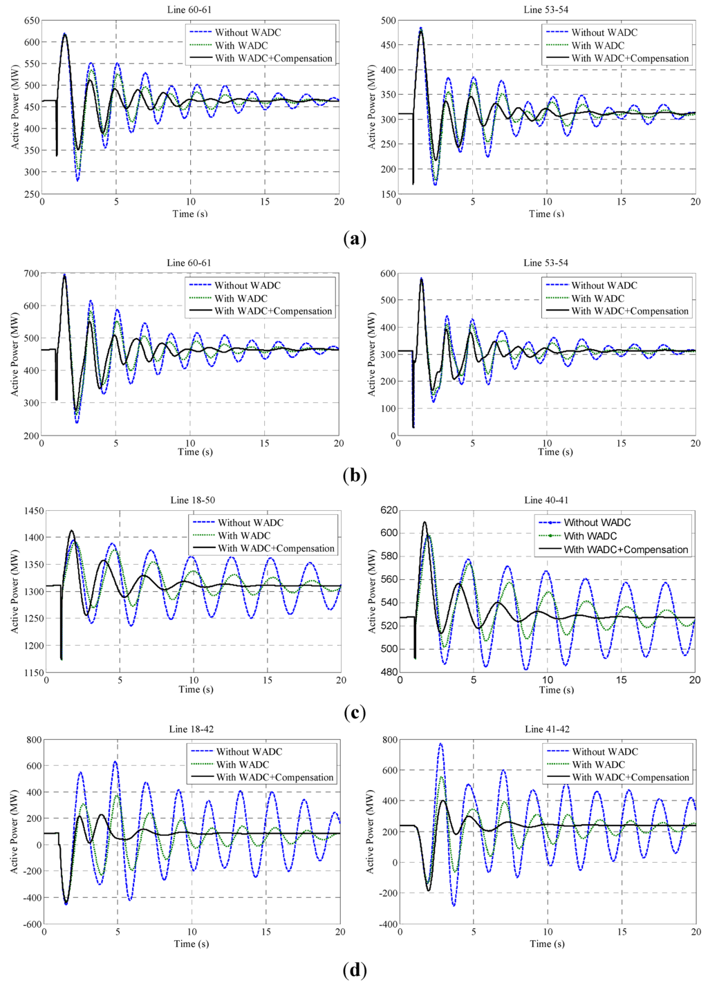 A comparison study on the effectiveness of inter-area oscillation control in the four disturbance scenarios with no WADC (only LPSS), WADC only, and WADC plus the time delay compensation under different time delay conditions was conducted, with results shown in Figure 8, which plots the selected line flow for the four above-mentioned cases with no WADC, WADC only, and WADC plus the time delay compensation under different time delay conditions. Because of insufficient damping in the critical inter-area oscillation modes, the system will take quite a long time to settle down if only LPSSs are installed. However, with the help of the proposed adaptive WADCs, oscillations are quickly suppressed in all cases as shown in Figure 9.