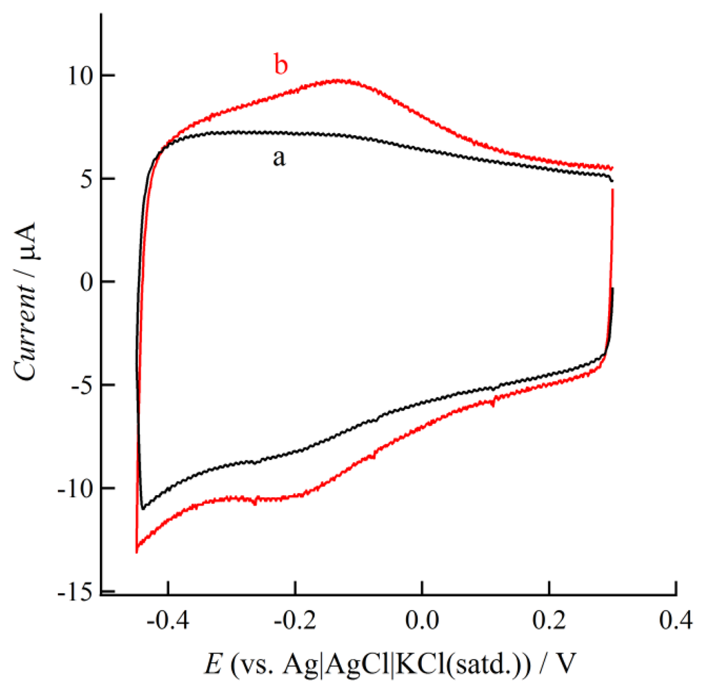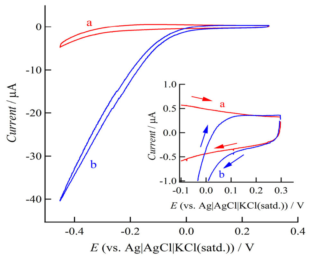 CV measurements were performed in the Hb and H2O2 absent and present PBS solutions at the formed ITO electrodes. The ITO, Pt wire, and a silver-silver chloride saturated potassium chloride (Ag|AgCl|KCl(satd.)) were used as a working, counter, and reference electrodes, respectively. All potentials are quoted against the Ag|AgCl|KCl(satd.) electrode in this paper. The surface area of the working electrode was standardized by a Teflon-coated O-ring with inner diameter of 12 mm. CV was carried out in 5 µM Hb and 1.8 mM H2O2 absent and present PBS solutions with the sweep rate of 0.5 V s−1 or 0.01 V s−1. The electrode potential was swept between +0.3 V and −0.45 V.