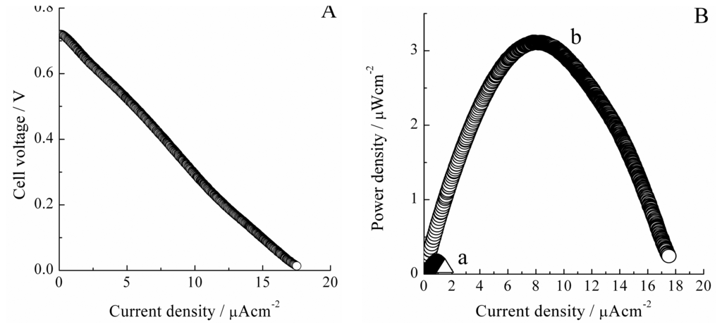 In this study, we examined the I-V characteristics on the single cell with the MEA in the anode. Figure 3A shows the I-V characteristics recorded with the sweep rate of 50 nA−1 in the single cell type II. The cathode was composed of 5 µM Hb and 1.8 mM H2O2 containing PBS solution and the prepared ITO-coated glass plate electrode. The OCV of this cell was observed at around 0.72 V. The improved OCV would indicate the inhibition of the cross-over phenomena of H2 to the cathode because H2 gas was not supplied to the electrolyte directly but from the backside of the electrodes. The power density was calculated from the data of the I-V characteristics and plotted in Figure 3B(b). The power density characteristics were improved approximately 20-fold from those of the single cell type I as seen in Figure 3B(a). The origin of the improvement of the power characteristics should be mainly attributed to the anode, since the construction of the cathode was almost the same as that in the single cell type I. Since the H2 gas diffused in the Pt dispersed layer, the oxidation of H2 should mainly occur at the three-phase boundary consisting of gas/liquid/solid interfaces in the anode, indicating the increasing concentration of H2 and the enlarged active surface area for H2 oxidation. Additionally, the PBS solution phase in the anode side was removed and Nafion® membrane directly adhered to the Pt dispersed layer, thus, it was expected to decrease the solution resistant of the electrolyte. Consequently, we successfully obtained a maximum power density of 3.1 µW cm−2 at around 7.9 µA cm−2 on the single cell applying the Hb-ITO system based on the DET and the electrocatalysis for the reduction of H2O2 in the cathode.