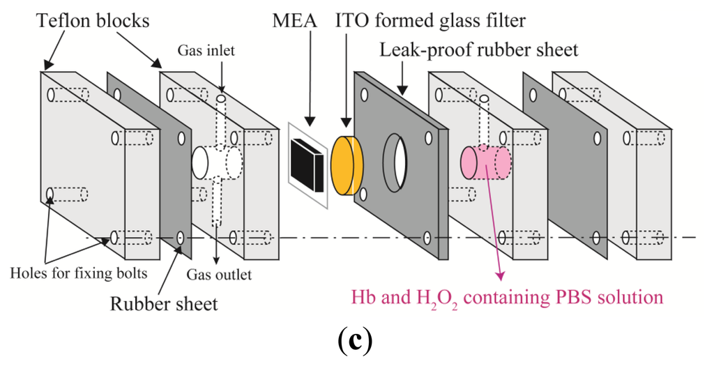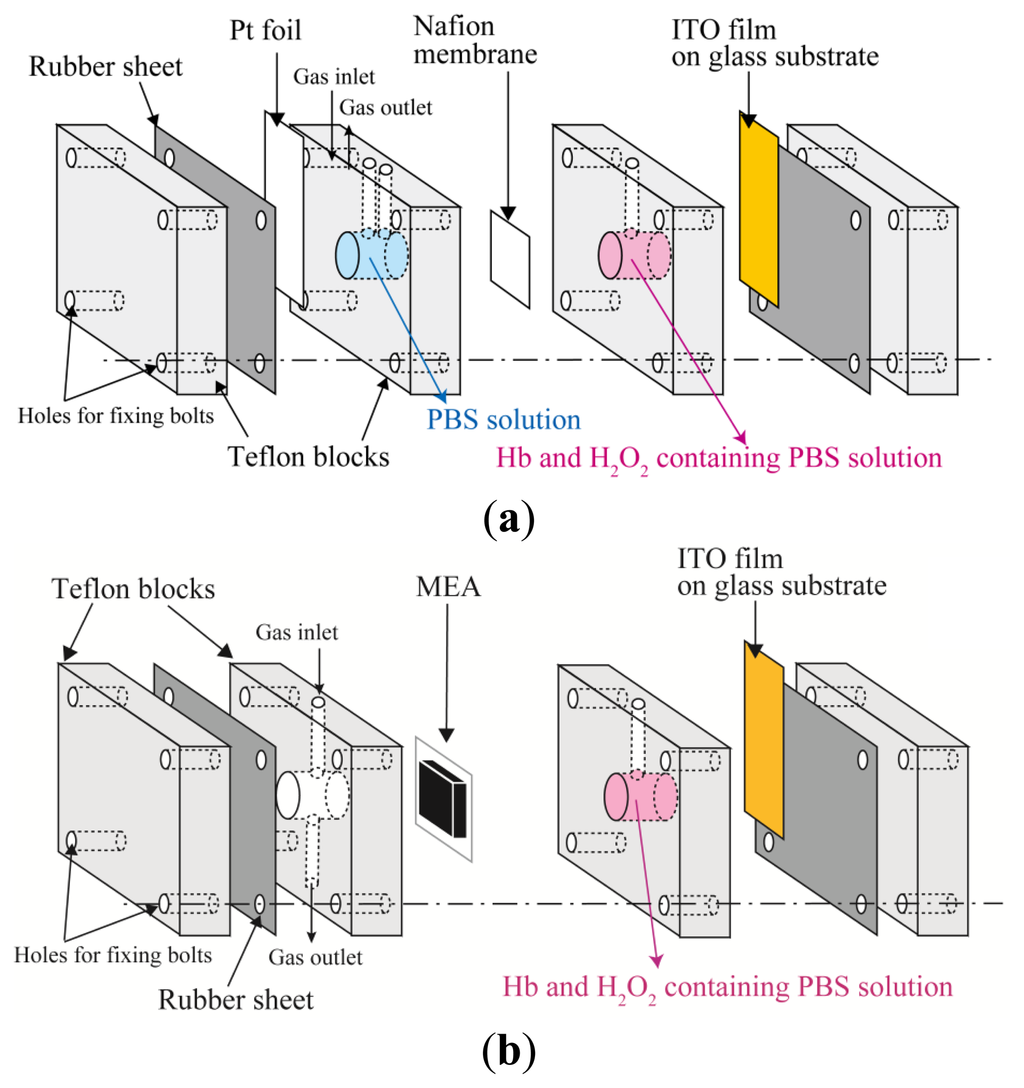 First type, named type I, was a most basic single cell as reported previously and shown in Figure 4a. A Pt foil and the ITO electrodes were used as the anode and the cathode, respectively. Nafion® 117 membrane (DuPont) was employed to maintain ion transport and prevent the penetration of Hb molecules to the anode. To purify and exchange with H+, the Nafion® membrane with 20 × 20 mm2 was soaked in 3% H2O2 solution and boiled for 1 h, then stored in dilute H2SO4 solution. The pretreated Nafion® membrane was soaked with water and placed between two Teflon blocks with 10 mm diameter of cylindrical center hole. After assembling of the single cell, the two cylindrical center holes were filled with PBS solution at the anode and 5 µM Hb and 1.8 mM H2O2 containing PBS solution at the cathode. H2 gas was produced in a water electrolysis cell and provided to the Pt foil electrode by the bubbling of the solution in the cylindrical hole at the anode.