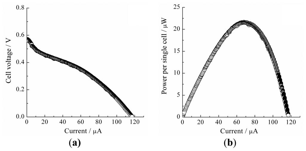 Figure 5a shows the I-V characteristics recorded with the sweep rate of 50 nA s−1 on the single cell type III. The observed OCV was 0.57 V. This value was lower than that of the single cell type II. In the single cell type III, the Nafion® membrane was directly contacted and pressed with the ITO porous glass. It was most likely that the thin electrolyte layer and/or the mechanical, physical, and morphological change of the Nafion® membrane might bring about the cross-over phenomena of H2 and H2O2. Although it was difficult to discuss for the I-V characteristics at the high current range over 60 µA in Figure 5a, typical diffusion-limited current would not be observed, indicating further potentiality for developing high performance BFC cathode. The power characteristics on single cell type III were considerably improved and the maximum power per single cell was observed at around 21.5 µW, as shown in Figure 5b. This improvement of the single cell performance should be attributed to the enlarged active surface area of the cathode composed of Hb-ITO systems.