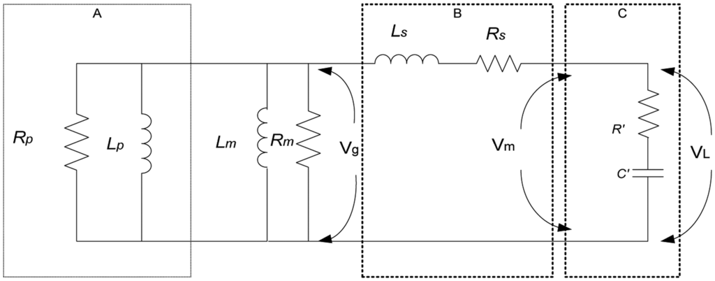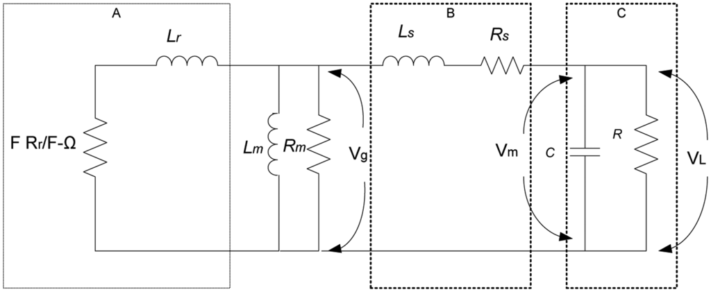 In order to simplify the analysis, the series/parallel impedances of the IG model and load circuit shown in Figure 1 (boxes A and C, respectively) are converted to their parallel/series equivalent impedances. This results in the simplified circuit shown in Figure 2. The rotor parallel circuit parameters of the IG marked in box A are given as []: