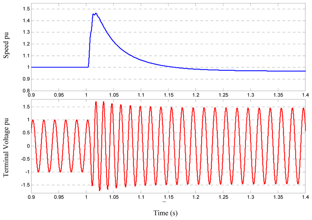 Scenario 3: In this case, the IG is disconnected from the grid with a local active load equal to 40% of the machine rating and no local excitation (capacitor). The absence of the excitation reactive power causes the machine terminal voltage to collapse. As shown in Figure 9, the machine voltage initially increases, but due to lack of local excitation, it is unable to maintain the terminal voltage. Also, the speed increases dangerously high.