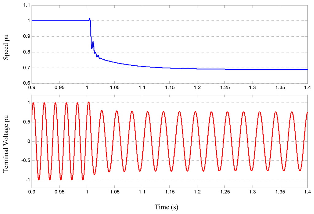 Scenario 5: in this case, the IG is disconnected from the grid with active load and reactive load each equals to the machine rating. As the total load exceeds the machine rating, the terminal voltage and the machine speed decrease, as shown in Figure 11.