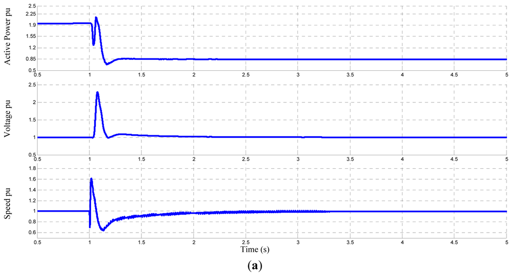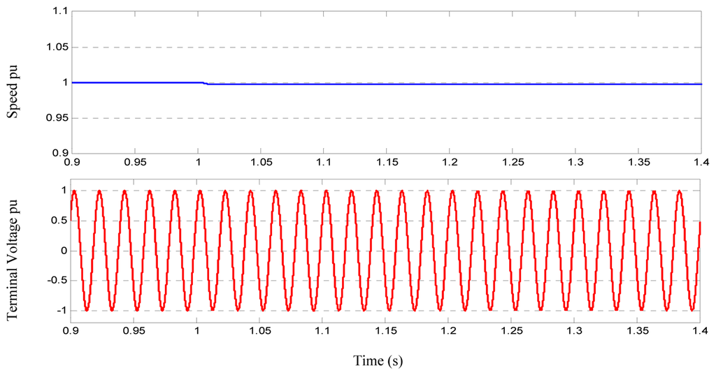 Scenario 6: The IG local load is set to the optimum active and reactive values defined in Section 3: 0.8473 pu active load and 0.5081 pu reactive load. The machine is disconnected from the grid at 1 sc. and continues to run and supply its local load. As shown in Figure 12, the terminal voltage and the machine speed are constant with an error of only 0.02% following to the islanding event. Therefore, islanding the IG will be safe only if the local load is kept constant within the optimum range.