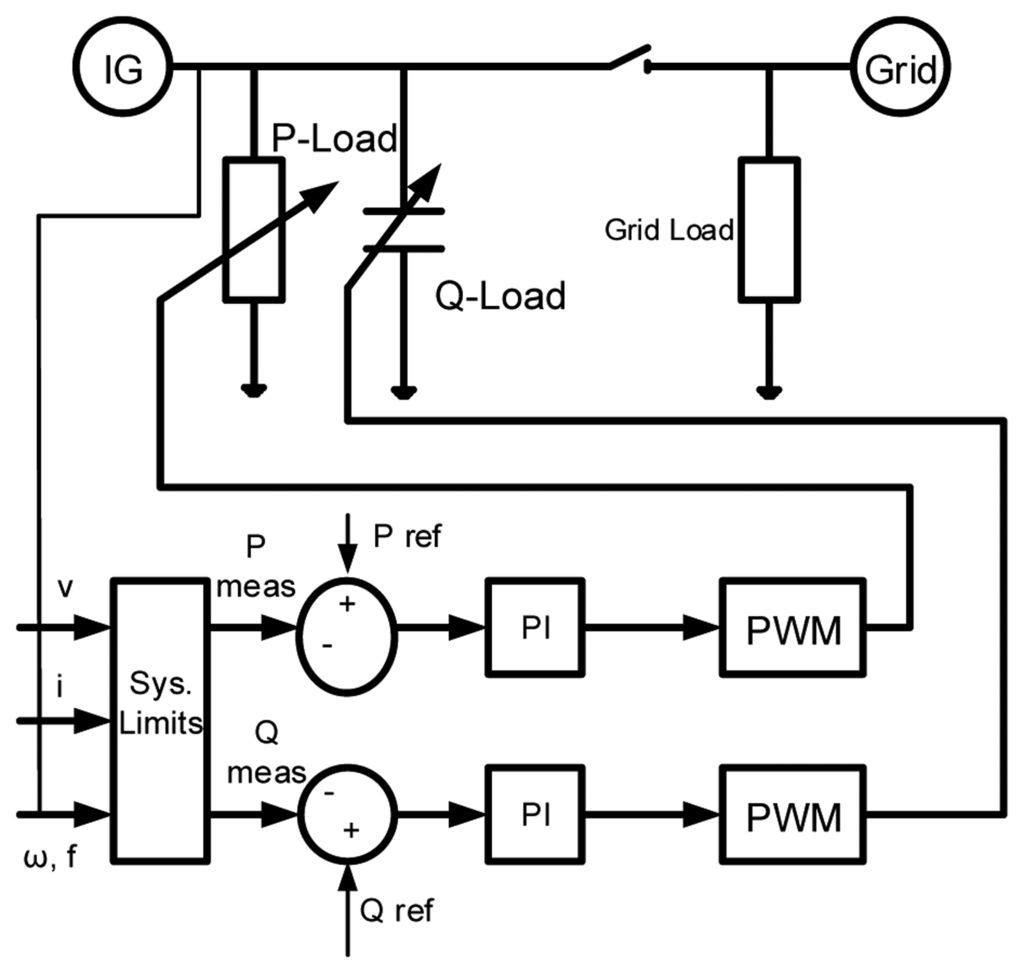 For the purpose of illustration, a conventional PI controller has been used, as shown in Figure 14, to control the local active load connected to the IG when it is islanded under different loading conditions. The controller is designed to monitor the machine's terminal voltage and frequency and control these by using a PWM control of a dummy local load. In a real system, local domestic loads (including Electric Vehicles chargers) may be controlled through demand side management. Reactive power control would be an added resource and this is achieved via thyristor-switched-capacitors as shown in Figure 14.