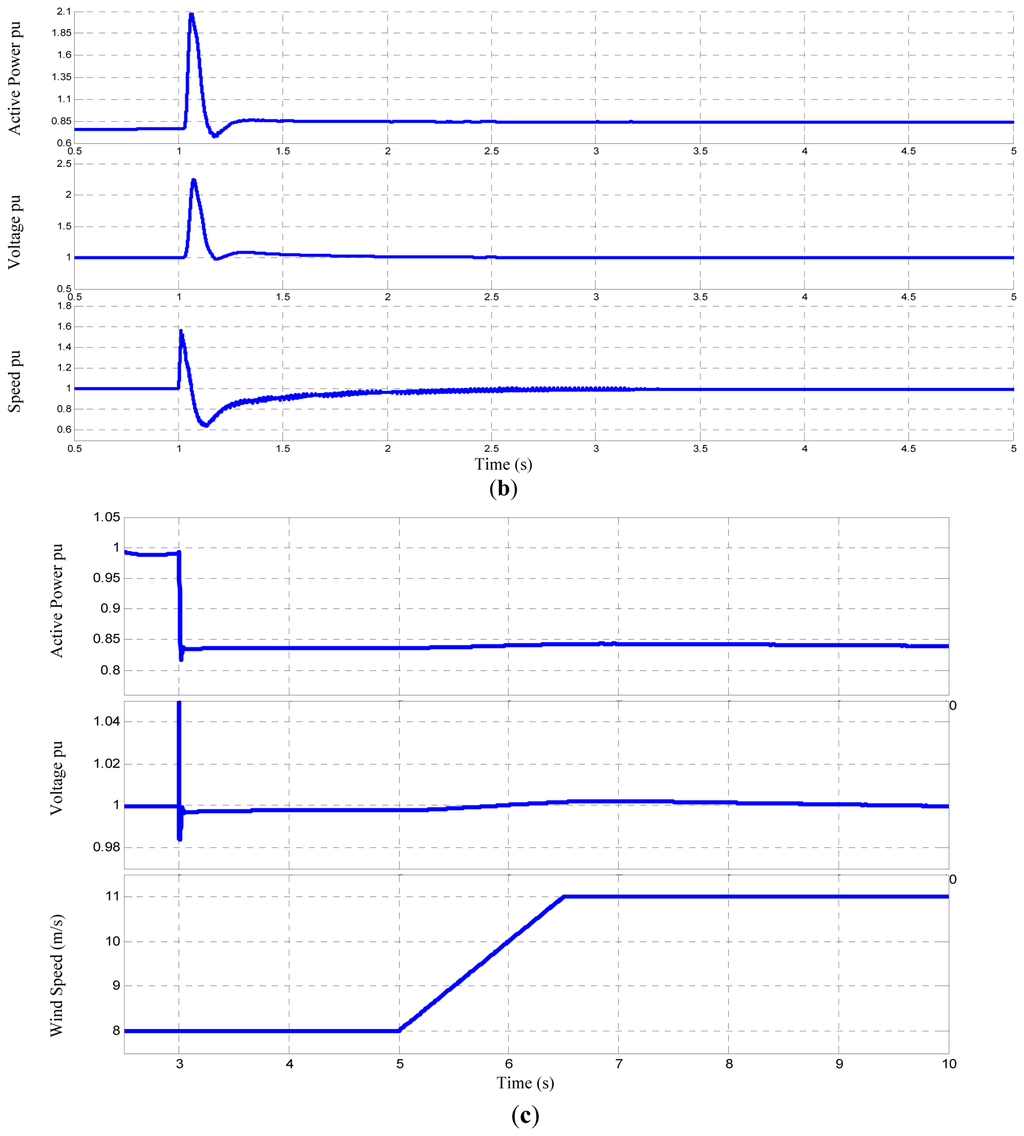 With wider use of SEIG in small and medium wind generation, it is important to investigate the impacts of wind fluctuation on the controller performance and this is presented in Figure 15c, where the IG is islanded from the grid at time 3 s, then the wind speed is changed at slow rate of 2 m/s at time 5 s from 8 m/s to 11 m/s. It is clear from the system response that the algorithm is robust enough to keep the local active power and terminal voltage within the operating region.