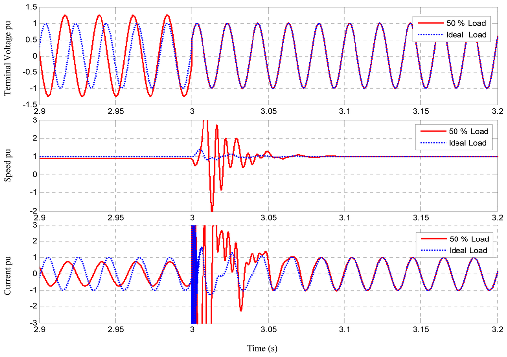 The middle part of the figure shows the machine speed for both cases before and after the reconnection. It is clear that the response following the reconnection is better for the case with optimum loading and excitation. The results also show that it is better if the machine is reconnected to the grid at the appropriate point on the voltage waveform.