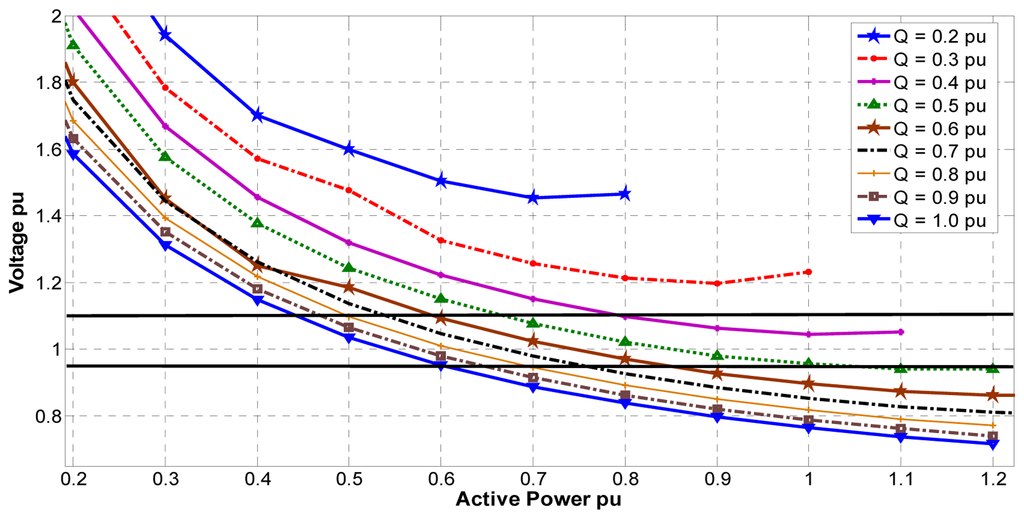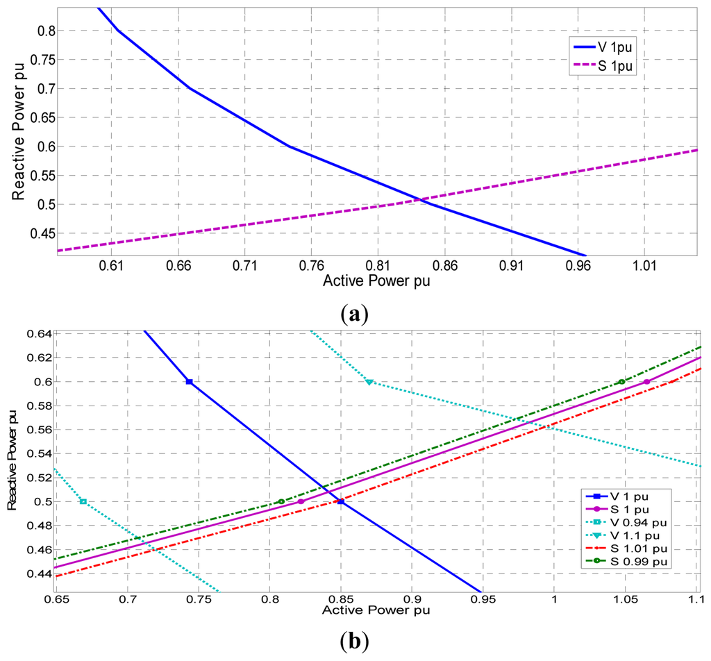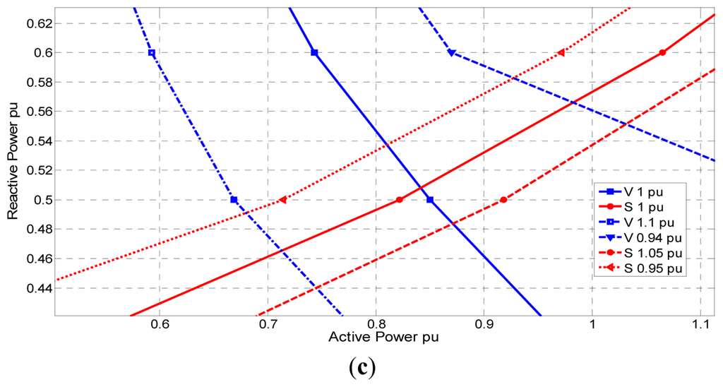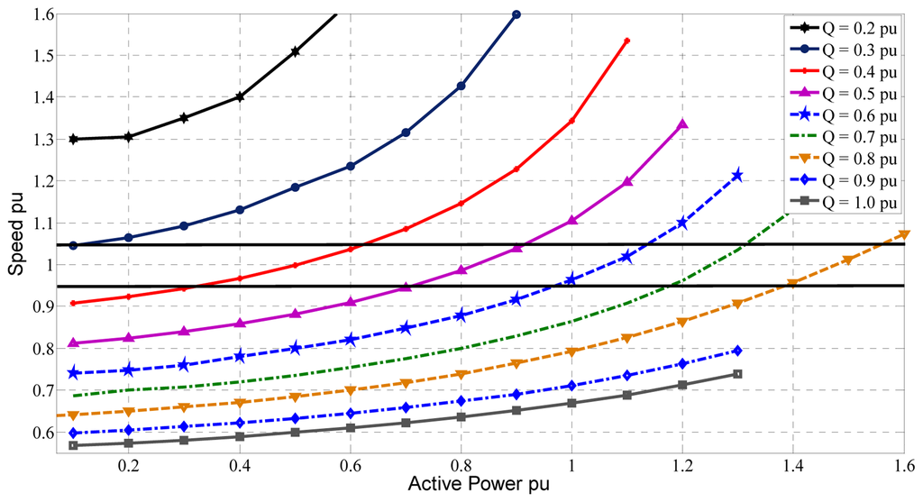 The operating points of the IG to produce terminal voltage magnitude and frequency (as defined in Figures 6 and 7, respectively) within the acceptable standard, are redrawn in Figure 8a. It is clear from this figure that there is only one operating point at which the IG will run at optimal values for both voltage and speed (frequency). This point is the intersection between the two curves defined as 1 pu voltage and 1 pu speed. The operating point represented by 0.8473 pu for local load active power and 0.5081 pu for local load reactive power (excitation capacitance) is the optimum active/reactive load for the induction generator to operate at. Figure 8b shows the feasible operating area for the IG machine when the terminal voltage is limited within the boundary of the standards (+10%, −6%) and the machine speed is limited to ±1%. It is clear that the IG machine can operate satisfactorily if the local active load is controlled between 0.71 pu and 0.99 pu and the reactive power excitation is regulated between 0.46 pu and 0.57 pu If the speed limit is relaxed to ±5% (for example, in case of a grid fault or emergency), the feasible operating area increases significantly, as shown in Figure 8c.