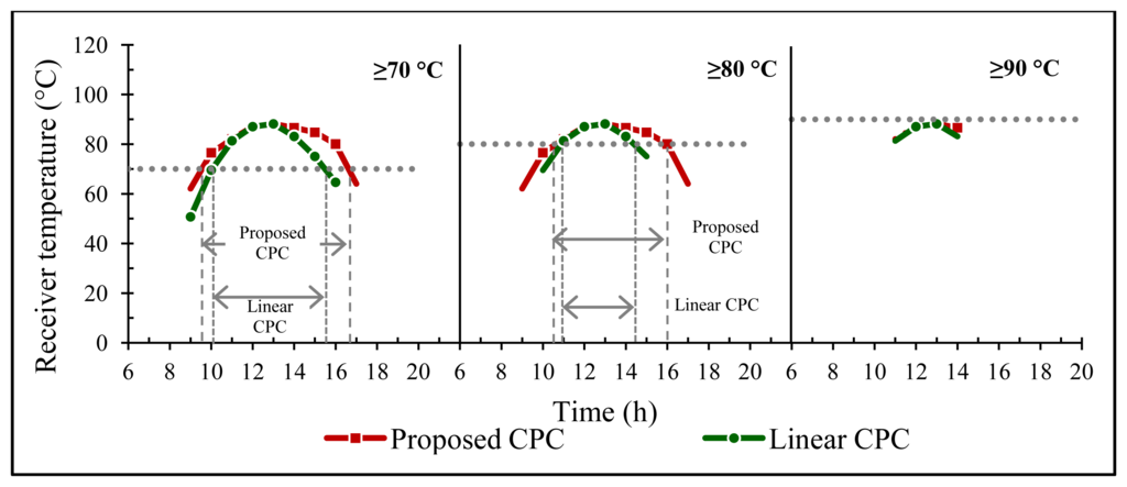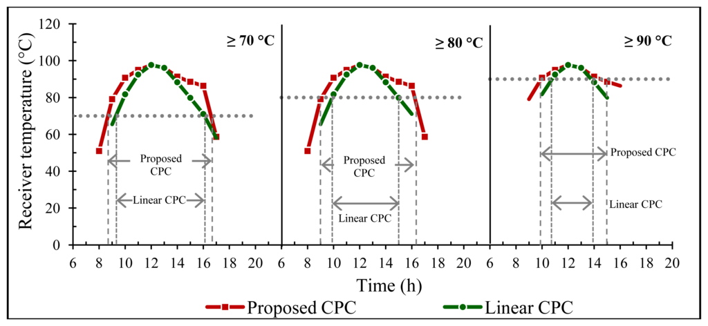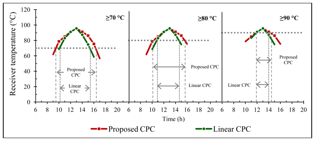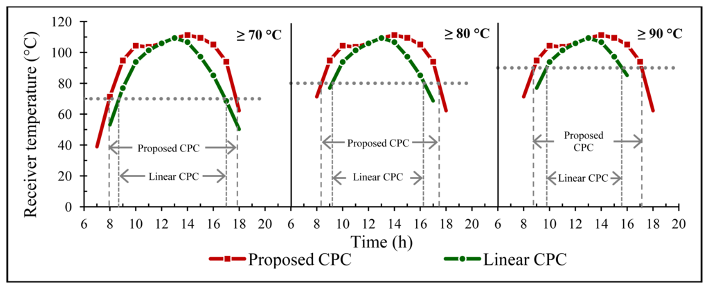 The temperature was estimated for the proposed CPC at the optimum settings (50° bending angle for the east and west wings at a 45° tilt and a 35° tilt of the central part of the CPC) using actual weather data for various seasons in Tokyo. The maximum temperature among the three parts of the CPC was considered as output temperature from the proposed CPC. The temperature from the proposed CPC was compared to that of a linear CPC with same length facing south fixed at an optimum tilt angle of 35°. Temperatures of 70, 80, and 90 °C were considered minimum temperatures required to operate most systems. The length of time over which these temperatures were achieved was investigated for the proposed CPC and compared with a linear south-facing CPC for each temperature. Figure 8 shows the temperatures achieved by the proposed and linear CPCs for May. For 70 and 90 °C, the duration of usable temperatures increases by about 1.2 h for the proposed CPC compare to a linear south-facing CPC and for 80 °C the duration is increased by about 2.2 h.
