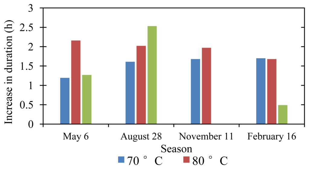 In August, the proposed CPC appeared to be more effective; the maximum increase in duration was 2.53 h for a required temperature of 90 °C (Figure 12). In November, a 90 °C temperature was not achieved based on the actual weather data for Tokyo, but for 70 and 80 °C the duration increased by up to 2 h.