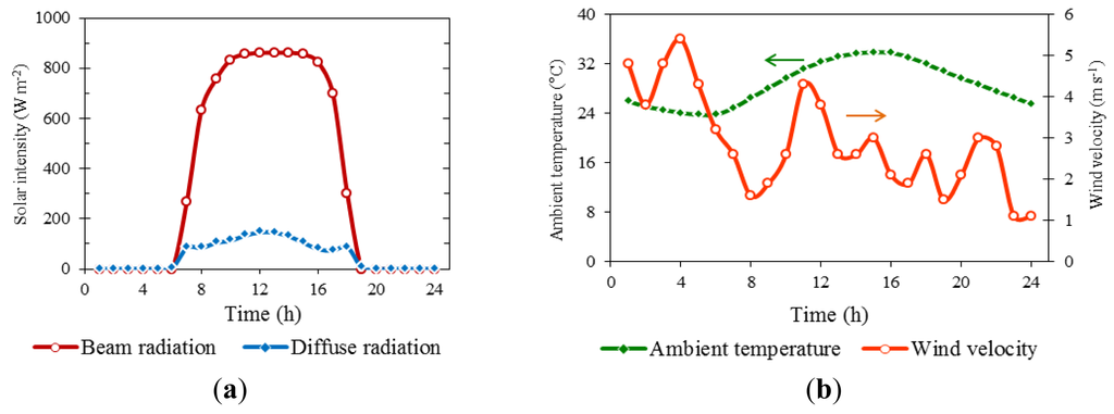Actual measured data for Tokyo for solar radiation, ambient temperature, and wind velocity were used in the simulation (Figure 2). To evaluate year-round performance, weather data for one sunny day in each month were selected. The data were obtained from the commercial software Meteonorm v. 6.1.