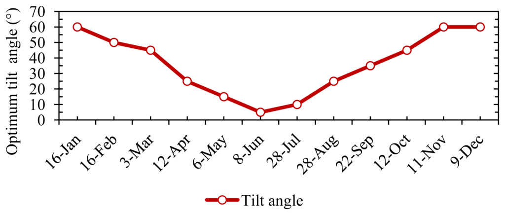 The proposed CPC with wings consists of east, west, and central parts (Figure 1). Initially, the optimum tilt angle for the south-facing central part was determined for year-round operation. The energy absorbed by the tubular receiver of the central part was calculated using Equation (4) at different tilt angles for selected sunny days of each month and the optimum tilt angle was identified. Figure 3 shows the optimum tilt angle for the central part for each month of the year.