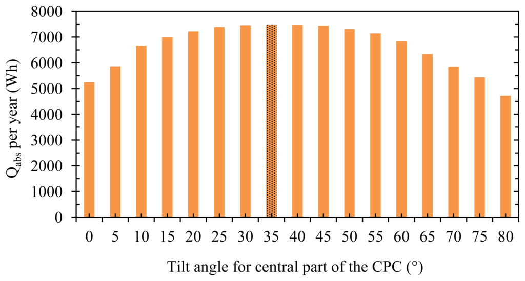 The maximum energy was absorbed using smaller tilt angles in the summer and larger angles in the winter. The year-round optimum fixed tilt angle for the central part of the CPC was found by summing the energies absorbed at each tilt angle in all months; the maximum of the summed energy was absorbed at a tilt angle of 35° (Figure 4). There was not a substantial difference in the absorbed energies among tilt angles of 25°–45°.