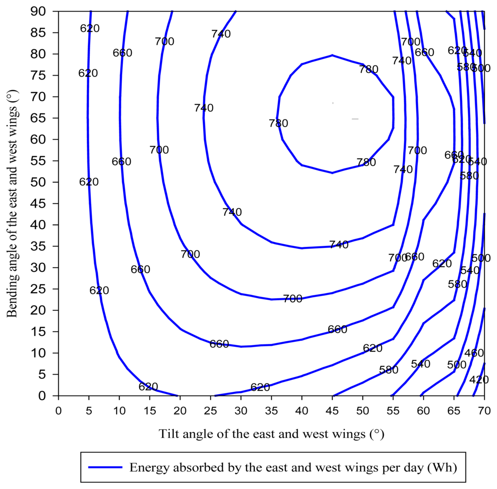 The optimum settings of tilt and bending angles for the wings of the proposed CPC were determined by calculating the sum of the energy absorbed by east wing in the morning until 11:00 and the energy absorbed by the west wing after 13:00, given by: