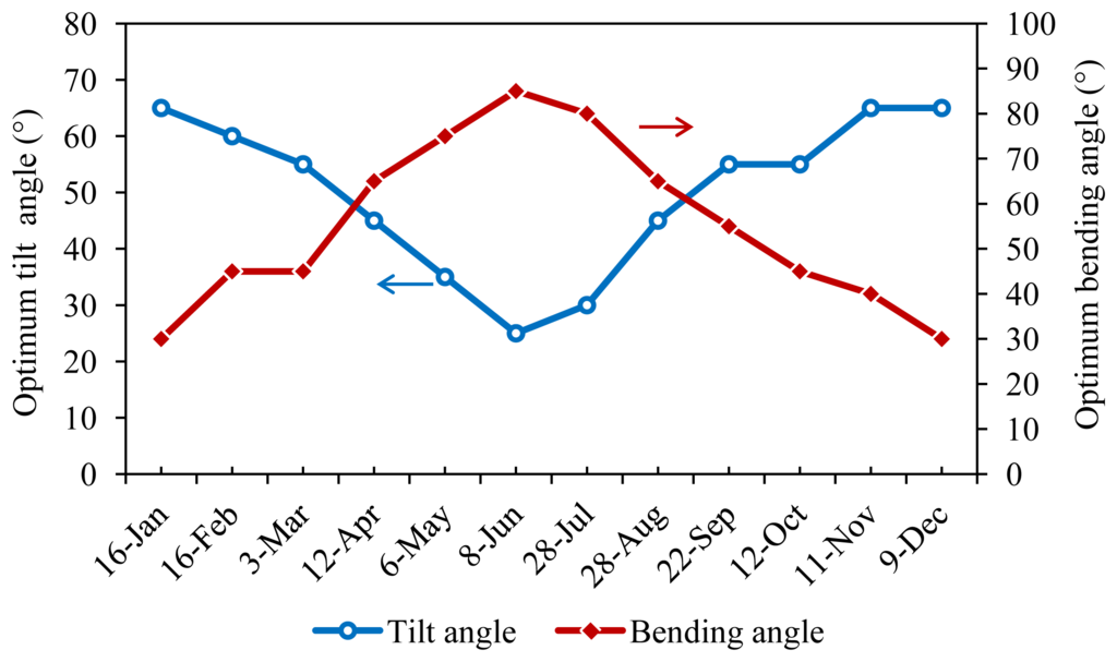 To determine a single fixed optimum setting for the proposed CPC, the energy absorbed by the east and west wings at each tilt and bending angle for each month was summed (Figure 7). The optimum settings were found to be a 45° tilt angle and 50° bending angle for the east and west wings. In summary, the optimized year-round settings for the proposed CPC with wings were identified as a 35° tilt for the central part and a 45° tilt for the east and west wings angled at 50°.