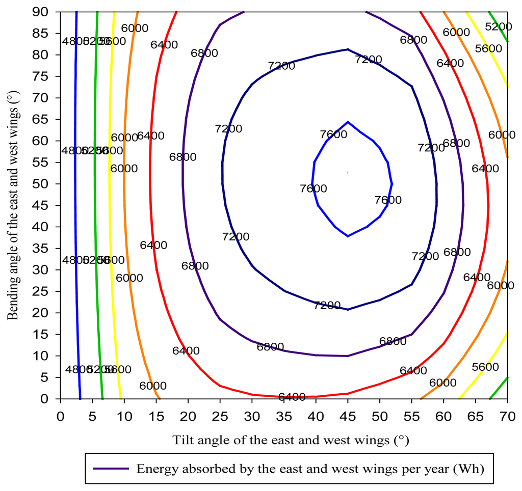 The optimum tilt and bending angles for the east and west wings were found to be 45° and 50°, respectively.