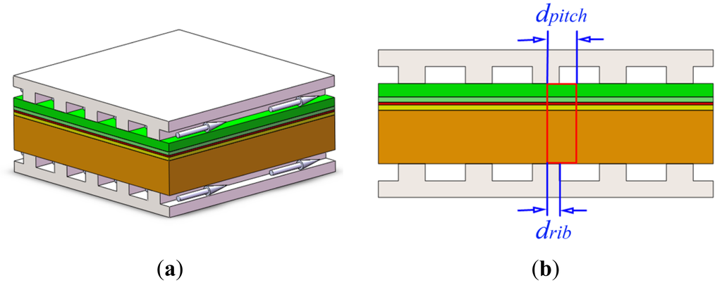 Small grooves in interconnectors are defined as channels, which are commonly used to carry the fuel and air gas flow. The ribs, which separate and define the channels, make direct contact with the electrodes. In designing the layer architecture, there is a tradeoff that must be considered between the rib and channel sizes. On one hand, wider ribs and ribs covering a bigger fraction of the cell area may reduce the interface resistance to current flow by increasing the electrode-interconnect contact area and reducing the current path through the possibly high resistance electrode material. Hence, such ribs will give a better conduction of the electrical current and reduce ohmic losses. On the other hand, the chemical species do not diffuse as well underneath wide ribs. Narrow ribs are needed to facilitate more uniform distribution of reactive gases across the area of the electrolyte surface and thus to promote electrochemical performance. The implications of the tradeoff to the cell performance can be very significant. It was reported that the power density was only 0.76 W·cm−2 at 0.7 V operating voltage for the combination of 2.6 mm channels and 2.4 mm ribs at the cathode side, while that for 4 mm channels and 1 mm ribs was 1.03 W·cm−2 [12]. Clearly, optimizing rib and channel sizes are of the utmost importance to realize the full potential of SOFCs.