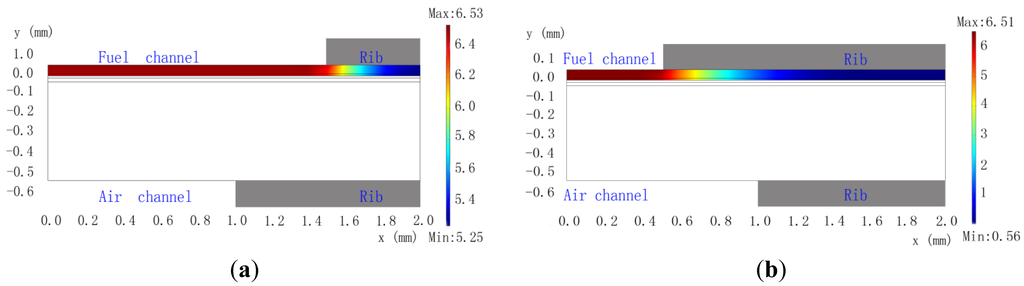 By comparing Figure 5 with Figure 6, it has been observed that the optimal anode rib width is smaller than the optimal cathode rib width for the same pitch width and contact resistance, which is contrary to the anode-supported situation. The reason is that cathode thickness is about 8 times the anode thickness for a cathode-supported SOFC. Thus, the influence of ribs on gas diffusion at the anode side is more serious than that at the cathode side for a fixed rib width. In order to reduce the concentration losses, the anode rib width should be relatively smaller than the cathode rib width.