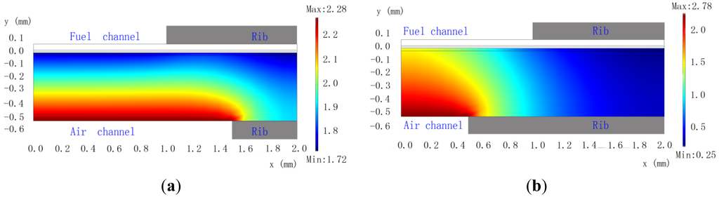 As shown in Figure 4a, although there is the change of O2 concentration in the vertical direction for Cell-C, the distributions of O2 concentration is reasonably uniform near the cathode/electrolyte interface. Figure 4b, however, shows a quite different situation for Cell-D. The change of O2 concentration near the cathode/electrolyte interface of Cell-D is quite large, decreasing from 1.5 mol·m−3 under the channel to 0.25 mol·m−3 under the rib, as can be seen in Figure 4b. Similarly to anode rib, the O2 diffusion is strongly influenced by the cathode rib. For Cell-D, the output current densities for Vop of 0.7, 0.6 and 0.5 V are respectively 0.4722, 0.5575 and 0.6290 A·cm−2, as given in Table 7. However, the output current densities of Cell-C are 10.5%, 18.1% and 26.7% more than that of Cell-D for Vop of 0.7, 0.6 and 0.5 V, respectively. Obviously, it is very necessary to optimize the cathode rib width for increasing cell performance.