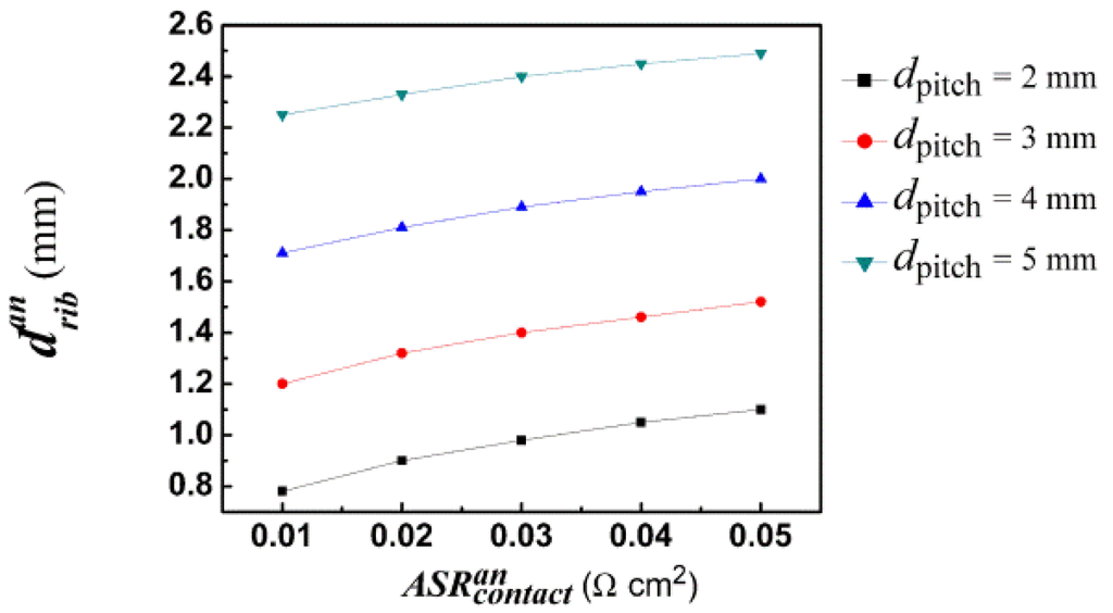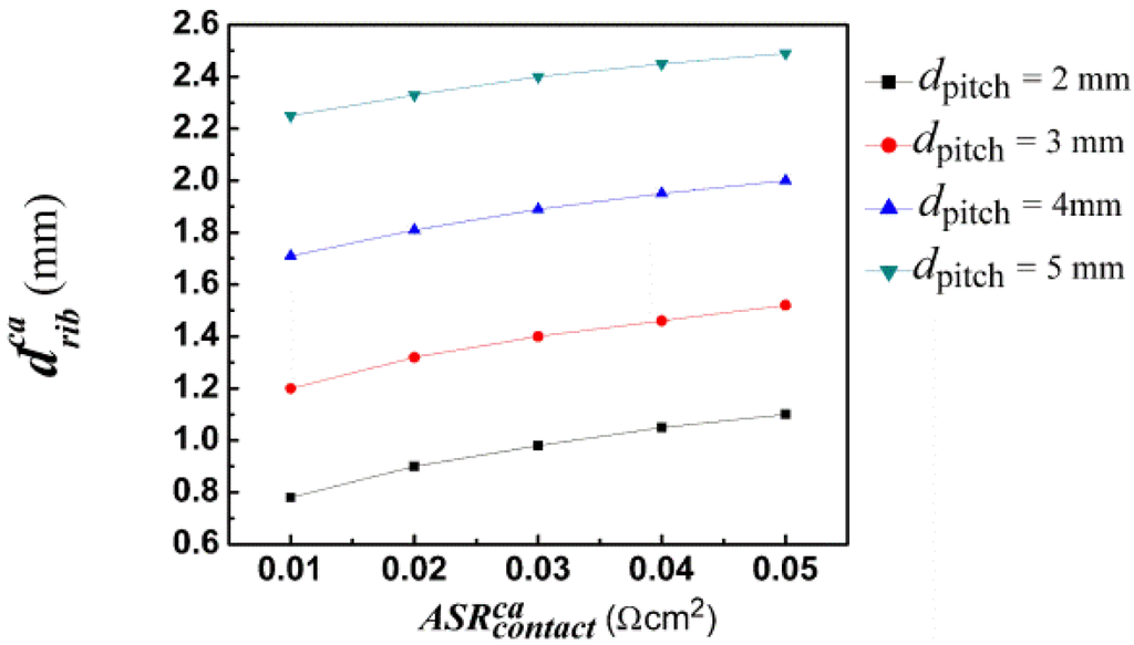 As described above, the cell performance depends strongly on the rib width and a suitable choice of the rib width is very important for high cell performance. An optimal rib width is obtained for a given pitch width by changing rib width to achieve the maximum cell current density [47]. Our previous study demonstrated that the optimal rib width is only sensitive to the rib-electrode contact resistance and pitch width [19,21]. Therefore we only discuss the relationship between the optimal rib width and rib-electrode contact resistance and pitch width in the following section.