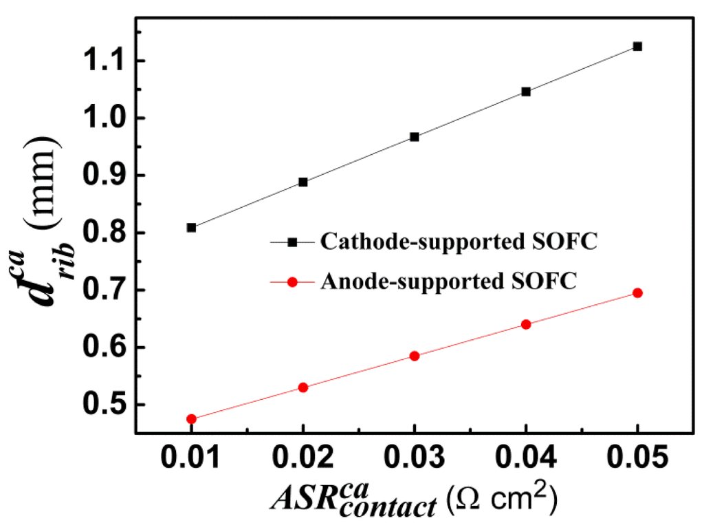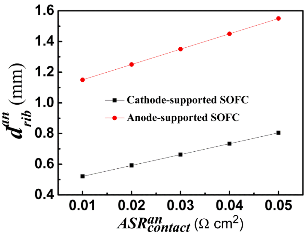 Unfortunately, the existing numerical studies on the rib design optimization have been carried out with two assumptions: (i) equal ASRcontact for the anode-interconnect and cathode-interconnect interfaces and (ii) equal width of the optimal anode and cathode rib widths. However, as demonstrated experimentally by Kornely et al. [12] and Dey et al. [20], ASRcontact for the anode-interconnect and cathode-interconnect interfaces can be very different. Therefore, the optimal anode rib width isn't equivalent to the optimal cathode rib width as the optimal rib width depends on ASRcontact [19,21]. Even if ASRcontact for the anode-interconnect and cathode-interconnect interfaces are equal, the optimal rib widths for anode and cathode should be different. Previous studies have already shown very different effects of the cathode and anode ribs on the mass transport in the electrodes. For anode-supported SOFC, the anode gas transport was only mildly affected by the anode rib, which is benefit from thick anode, while an oxygen depletion zone of 0.46 mm was found with a cathode rib width of only 0.8 mm due to thin cathode thickness limiting the oxygen diffusion to the area under rib [19]. On the contrary, for cathode-supported SOFCs, the anode rib has an important influence on the anode gas transport; the minimum hydrogen concentration under anode rib is only about one third of that under anode channel [22]. The existing experimental and theoretical findings indicate clearly that the optimal design of the stack cell should use different widths for the anode and the cathode ribs.