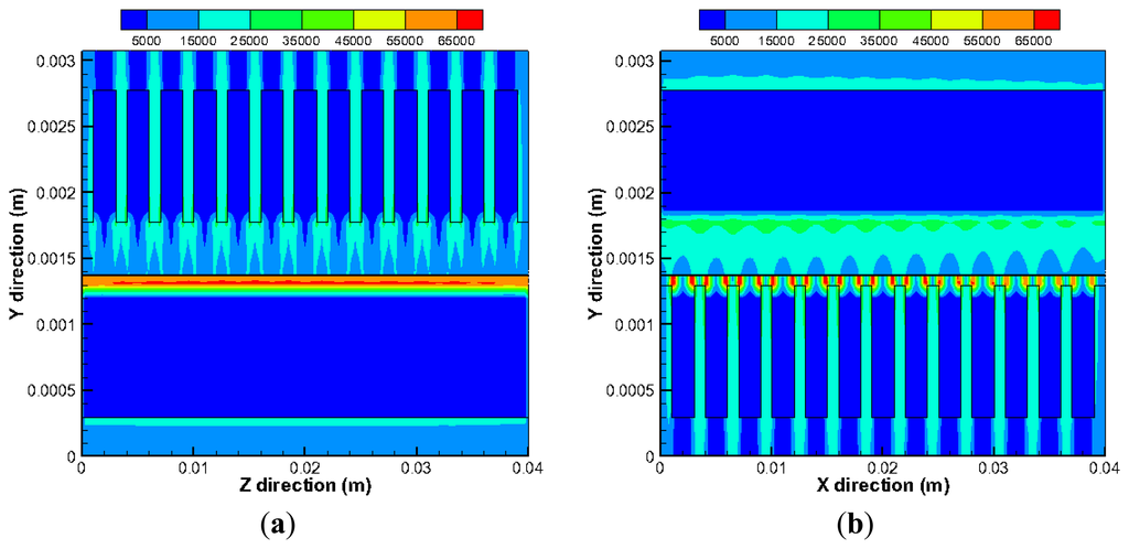 From Figure 12, we can find that the maximum current density in the cathode active area is larger than that in anode active area. The reason is that the thickness of the cathode electrode (0.07 mm) is much smaller than that of the anode (0.4 mm). It is also seen that the current density is decreased along the fuel flow direction (X direction), as the fuel concentration becomes low, even compensated by an increased temperature along the main flow direction [20].