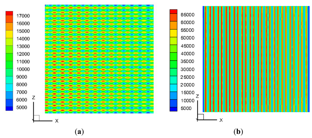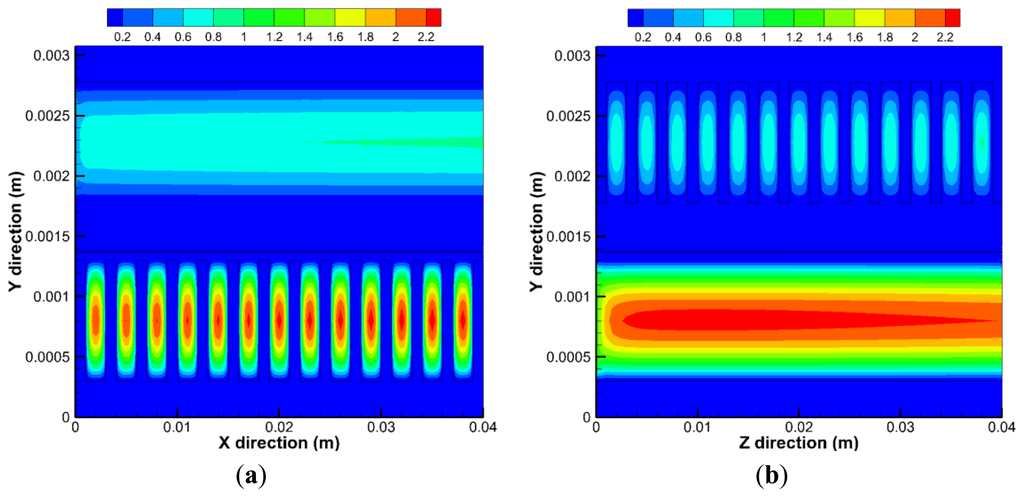 From Figure 11a, it is revealed that the current density distribution along the air main flow direction is very uneven in the electrodes, and the maximum value is located at the interfaces between the ribs and the cathode electrodes, and the minimum value appears in the anode electrodes corresponding to the middle of the channels. This is so because the electrons always transfer in the shortest path. From Figure 11b, it is also found that the maximum value of the current density in the cathode is decreased alone the X direction as the hydrogen in the fuel is being consumed along this direction and its concentration decreases.