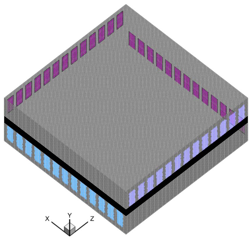 Considering the cells in the stack (except the cell at the top and bottom), we can define the outside wall of the cell being adiabatic. The operating conditions for the developed model are given as follows: operating voltage 0.7 V; the mass flow rate of fuel inlet per duct: 2 × 10−8 kg/s, the mass flow rate of air inlet per duct: 0.8 × 10−6 kg/s, as specified in Table 5.