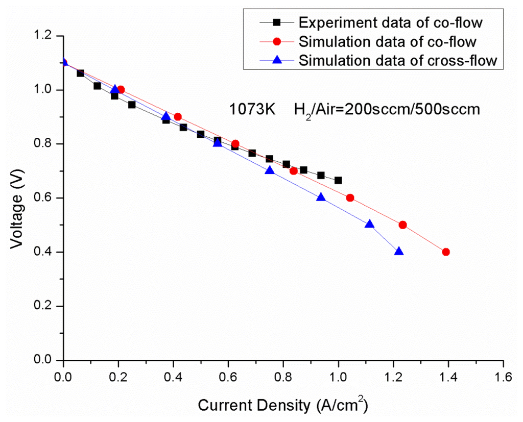 Ni-YSZ anode-supported SOFCs developed at the Chinese Academy of Sciences NIMTE were used for both the modeling and the experiment. The dimensions of the cells are 4 × 4 cm2, in which, a 400 μm thick Ni/8YSZ anode substrate was prepared by tape casting, followed by a 20 μm thick anode functional layer (anode TPB layer) and a 10 μm thick 8YSZ electrolyte layer. The cathode of the cell is a double LSM layer sprayed onto the anode substrate before it was co-sintered. The cells were tested in an alumina testing chamber. Platinum and nickel foils were used as current collectors at the cathode and anode sides, respectively. Silver mesh sandwiched between LSM was utilized for gas distribution at the cathode side; the silver mesh was applied to decrease the contact resistance between the cathode and the current collector. For the anode side, two layers of nickel foam were used for gas distribution and current collection. Air and humidified hydrogen were introduced into the cathode and anode, respectively. The operating temperature was 800 °C. The flow rate of hydrogen was 200 sccm, and the air flow rate was 500 sccm. Figure 3 shows the V-I curve predicted from CFD model compared with the experimental data under the same operating conditions. The cell was tested in a 800 °C heated oven, so the thermal isolation is assumed for the external walls during the validation, to agree with the experimental conditions.