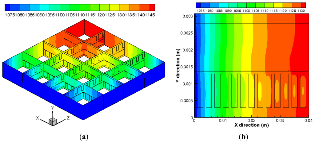 The predicted temperature distribution in the cell is shown in Figure 4. It is found in the Figure 4a that the temperature in the anode and cathode inlet is the lowest (1073 K), then it rises along the flow directions as the heat is generated due to the electrochemical reactions. The temperature reaches the maximum value about 1150 K in the regions close to the outlets of the fuel and air channels. Figure 4b shows the temperature distribution along the cell thickness direction (y) in the plane z = 0.02 m. The temperature in the air channels (bottom part) is lower than that in fuel channel at the same x position. This is because the mass flow rate of air (500 sccm) in the cathode is substantially higher than that in the anode side (200 sccm), and more heat is taken away by the flowing air.
