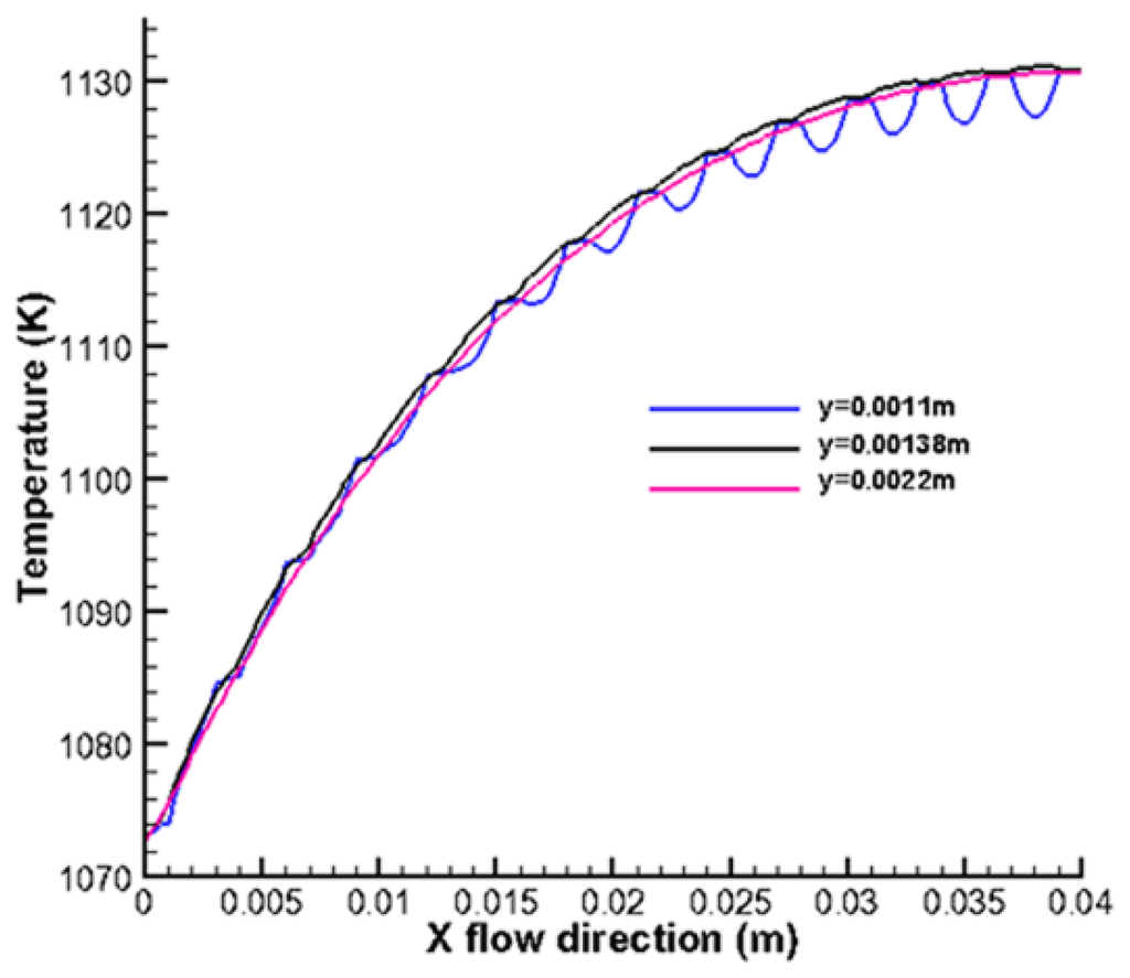 Figure 5 shows the temperature distribution along the fuel main flow direction in the plane z = 0.02 m at different cell height, i.e., y = 0.0011 m, 0.00138 m and 0.0022 m, respectively. It is revealed that, for the cross-flow arrangement, the temperature difference between different cell heights is very small and the temperatures in the fuel channel (y = 0.0022 m) and the electrolyte (y = 0.00138 m) are all increased along the fuel flow direction (x-direction), and the value of the temperature for y = 0.0011 m is a wave-shaped curve. This is because the temperature of the air is lower than that of the solid part in the cathode (see Figure 4b); The temperature in the electrolyte is the highest because of the heat source produced by the electrochemical reactions occurring nearby.