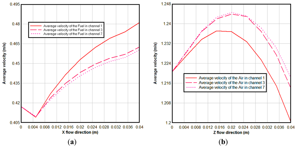 Figure 7 shows the average velocity of the gas in different channels. From Figure 7a we can see the average velocity of the fuel is decreased at first from the channel inlet, due to the fuel diffused to the anode diffusion layer at the beginning; then it is increased along the flow direction, it is so because the temperature is increased along the main flow direction and H2O generation due to the electrochemical reactions in the anodic TPBs. It can be seen also that the average velocity in the channel 1 is bigger than that in channel 3 and 7. This happened due to two reasons: first, the channel 1 is at the side of the cell, and correspondingly more reaction areas are expected; second, channel 1 is near the air inlet where the concentration of the O2 is higher. More reaction areas and high concentration of the O2 result in stronger electrochemical reactions here. At the cathode the oxidant reduction reaction occurs, i.e., O2 is consumed. This may reduce the velocity of the air in the air channel. At the same time, the high temperature increases the velocity of the air. In overall, the air velocity magnitude reaches to a maximum value and then decreases to the lowest value in the outlet, as seen in Figure 7b. The same reasons as for in the anode cause the average velocity of air channel 1 being lower than that in channels 3 and 7.