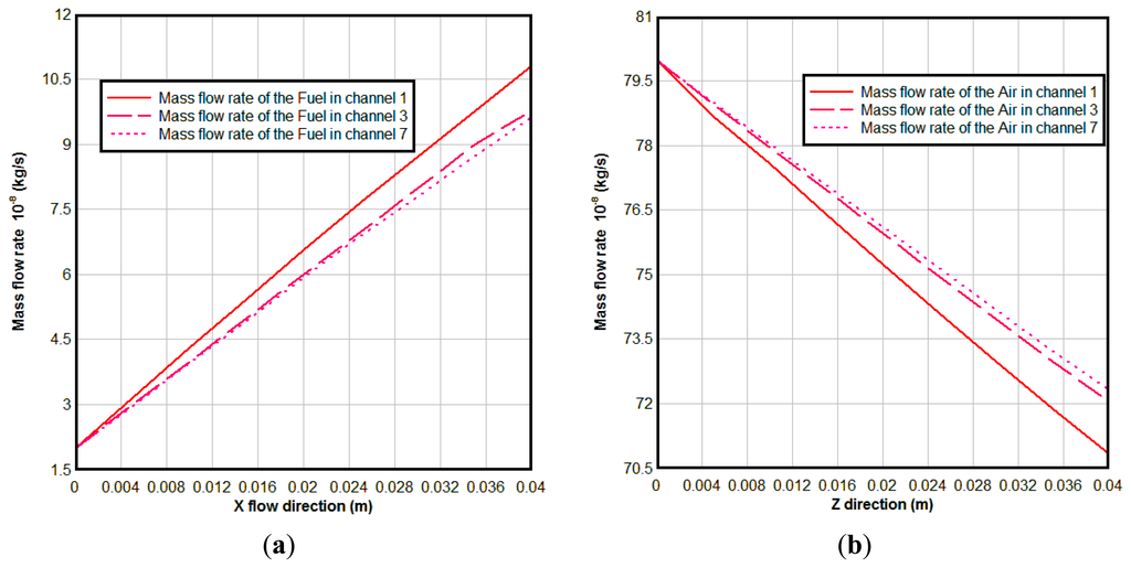 Figure 8 is the mass flow rate of the gases in different channels, From Figure 8, we can see that the mass flow rate of the fuel increases along the fuel flow direction, because of the H2O generation due to the electrochemical reactions in the anodic TPBs; while the mass flow rate of the air decreases along the air flow direction due to the O2 consumed in the cathode. The reason for the mass flow rate of fuel in channel 1 being bigger than that in channel 3 and channel 7 is that more reaction areas and high concentration of the O2 result in stronger electrochemical reactions here.