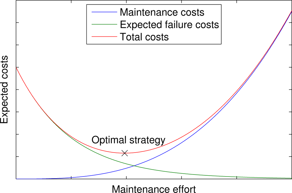 In many components, deterioration processes, such as fatigue, wear and corrosion, cause failures, for example in welded connections, blades, bearings and gears. In those cases, it could be possible to detect the damages before actual failure and, thereby, perform preventive maintenance instead of corrective. This requires some type of condition monitoring to give information on the health states of the components. It can either be through online monitoring or through manual inspections. The use of preventive maintenance could potentially reduce the costs, as repairs are mostly cheaper to perform before actual failure and because the downtime is less compared to corrective maintenance. On the other hand, preventive maintenance leads to more repairs in total, and optimally, the maintenance effort should be adjusted to minimize the costs, as illustrated in Figure 1.