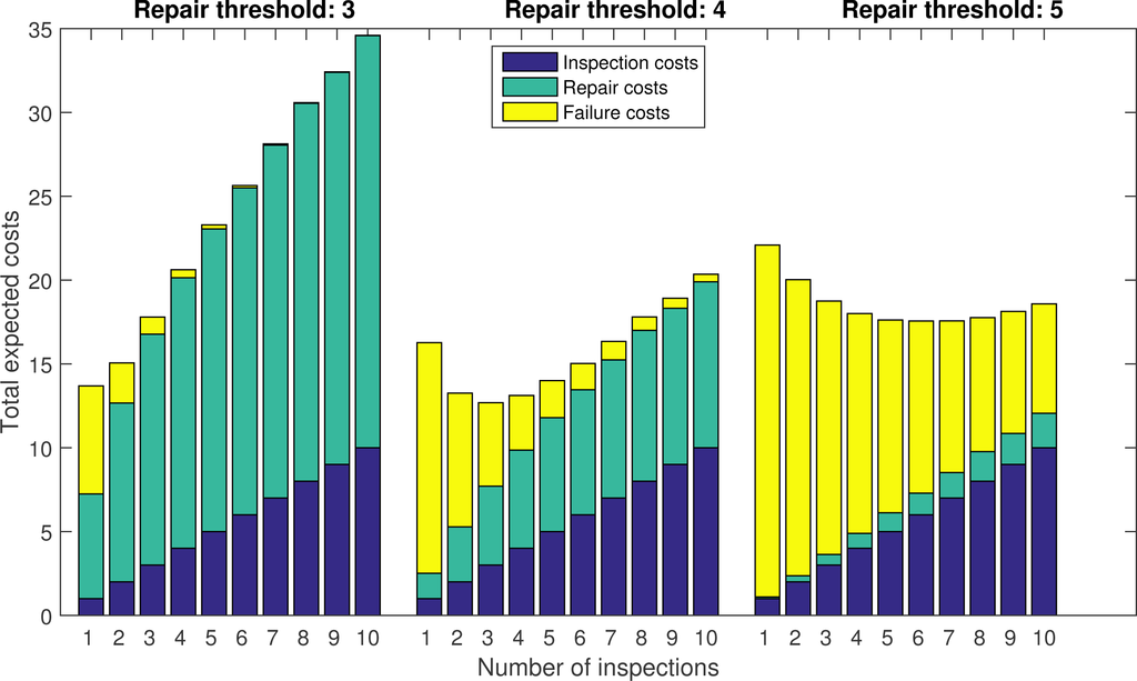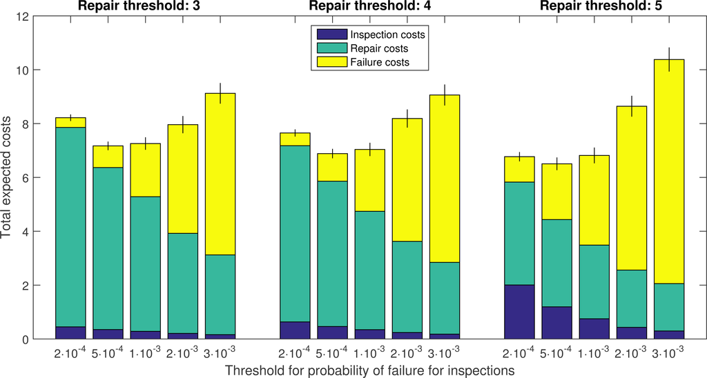 Figure 10 shows the total expected costs found using Method C for different thresholds for inspections and repairs using 100,000 simulations and 95% confidence intervals for the total expected costs. The lowest costs (6.5) are obtained at a threshold for the probability of failure at 0.0005 per month and a threshold for repairs at an inspection outcome of five (severe damage). However, the result is not very sensitive to changes in the repair threshold.