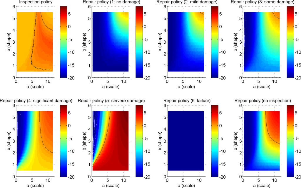 The decision on inspection is made based on the probability distribution for the damage size after monitoring, and the repair decision is made based on the probability distribution for the damage size updated using the inspection outcome, if relevant. The decision policies for inspections and repairs depend on time and on the probability distribution for the damage size after monitoring. This probability distribution is approximated by the nearest Weibull distribution in the grid; thus, the inspections policies depend on time, as well as scale and shape parameter a and b. The repair policies additionally depend on the inspection outcome.
