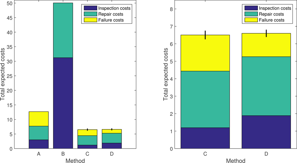 Figure 12 shows the expected costs obtained by each of the four methods. Methods A and B are the simplest to implement, as they use only simple decision rules. Even though Method B includes more information than Method A, as it includes monitoring, it performs much worse, since the costs are four-times larger. The reason is the large uncertainty on the monitoring outcome, as high alarms are obtained relatively often and, consequently, too many inspections are performed. Method C also includes monitoring, but the uncertainty is considered, as the monitoring outcome is used to update the probability distribution for the damage size, thereby changing the estimate of the probability of failure in the following time step. Therefore, Method C performs better than Methods A and B. Method D goes even further and uses the updated probability distribution for the damage size for both the decision on inspections and repairs, and repairs can be performed without first performing an inspection. The costs obtained by Method D are similar to Method C.