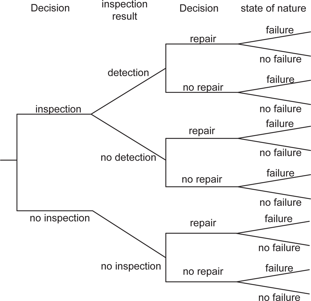 A decision rule often introduced is to repair only in case of damage detection at an inspection and, in some cases, to use a threshold for damages that are repaired. Secondly, repaired components are assumed to act as either new components or components with no damage detections. Thirdly, failures are considered to terminate the lifetime of the structure. Finally, the inspections can be made with either a fixed interval or whenever the reliability drops below a certain threshold value. In this way, only one branch in the decision tree continues. In case of preventive repairs, the assumption regarding repaired components determines how the costs are evaluated. In case it acts like a new component, the expected costs are found for lifetimes of all lengths up to the actual lifetime, and the results for shorter lifetimes are used when expected costs are found for longer lifetimes. If it acts like a component with no damage detections, the expected costs for the remaining lifetime are the same for the branch with repair as for the branch with no damage detections, and they can be evaluated as one.