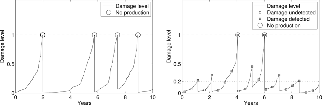 This approach is rather time-consuming and should not be used in cases where the probability of failure is very low, since too many simulations will be needed to give a good approximation of the expected costs. The approach is simple to implement, and an accurate model can be used for, e.g., damage growth. Figure 4 shows an example of simulations with corrective- and condition-based maintenance, respectively. After failure, there is a period with no production of power. When condition-based maintenance is used, there are fewer periods with no production, as some damages are detected during inspections and are repaired preventively. The approach was demonstrated in [13,14].