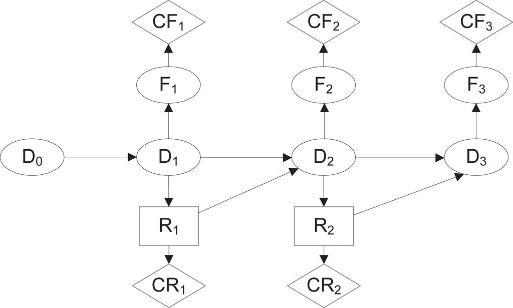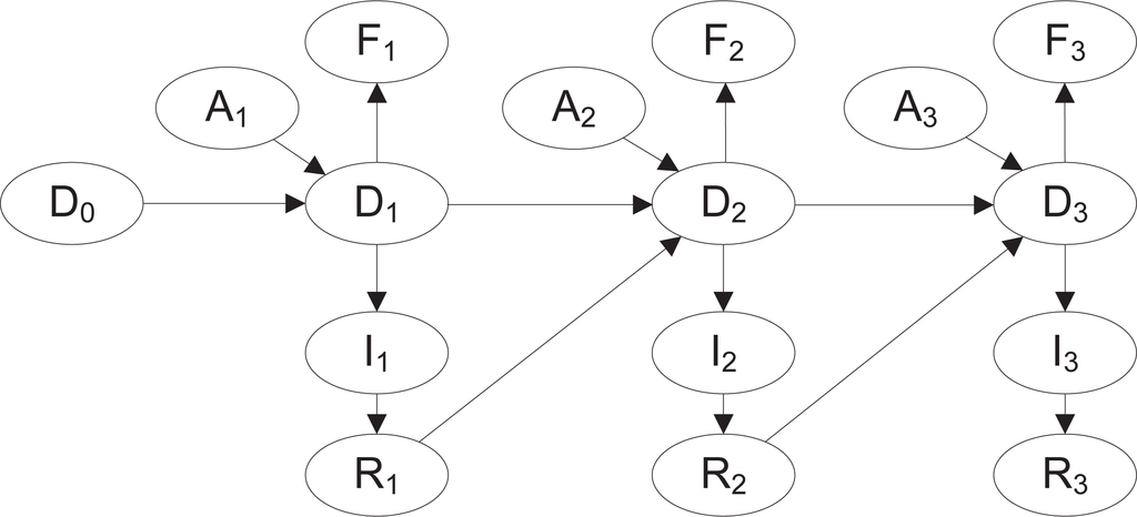 Figure 5 shows an example of a Bayesian network for deterioration modeling. The variables D, A and possibly I are continuous and are discretized in appropriate intervals; see [9,15]. The failure node F is discrete with two states: failure and no failure. Failure is assumed to happen when the damage size reaches the last interval of the node D. The repair node R is also discrete with two states: repair and no repair.