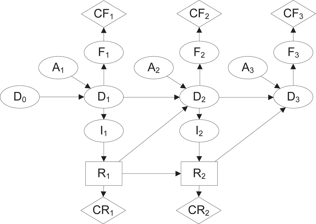 An influence diagram is an extension of a discrete Bayesian network representing a decision problem. In addition to the stochastic nodes in a Bayesian network, an influence diagram also contains decision nodes (rectangular) and cost nodes (diamond shaped). To represent the full decision problem, the decision nodes should be dependent on all observations from the entire past. However, this problem is generally intractable, just like the original decision tree, and approximations are necessary.