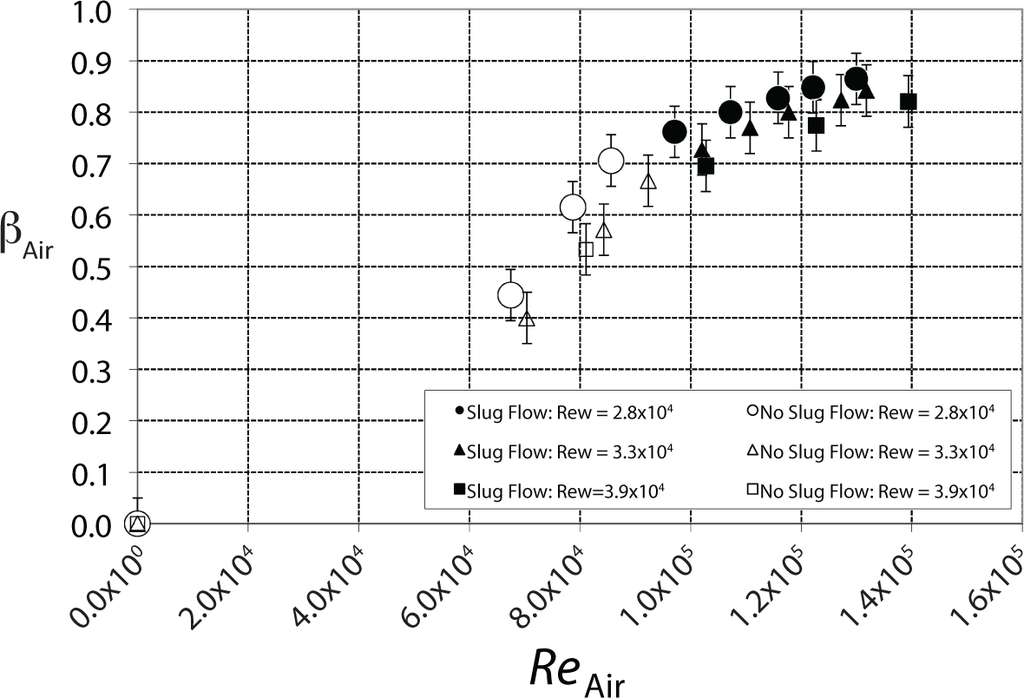 The air volumetric flux and total volumetric flux are computed based on the respective measured volumetric flow rates and respective inlet areas for air and water, and βAir becomes: