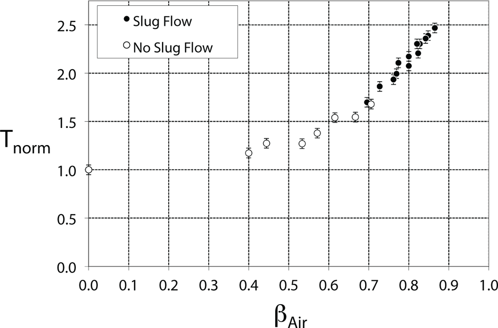 Figure 11 illustrates normalized mean thrust data as a function of air volumetric flux quality, βAir, for the Contoured SFE configuration. Filled symbols in Figure 11 indicate that slug flow was observed for that particular component flow rate of water and air. Figure 11 reveals normalized thrust data to coalesce to a single curve. For the range of values considered in this investigation, normalized thrust was found to increase linearly with respect to βAir with the onset of slug flow. For βAir ≈ 0.87 the normalized thrust was shown to be augmented approximately 2.5 times. It is hypothesized that the slug flow regime generated by the SFE would be the most effective flow regime to increase thrust output. Additionally, Figure 11 shows the normalized thrust to increase substantially beyond βAir > 0.7. It is conjectured that this trend was in some way related to the frequency of the liquid slugs being generated by the SFE.