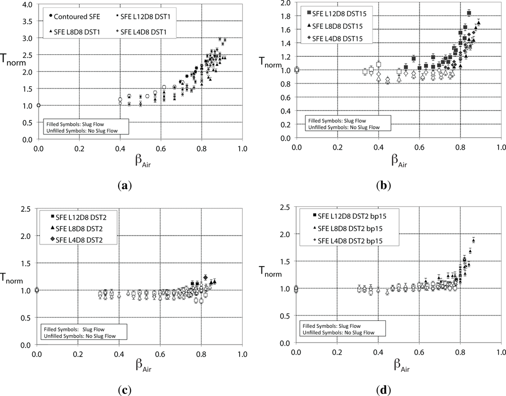 It has been observed that SFE geometries incorporating 25 mm ID downstream tubes in the design produced greater normalized thrust than SFE geometries with 38 mm and 51 mm ID downstream tubes. In addition, SFE geometries with shorter cylindrical cavity lengths (102 mm) produced greater normalized thrust than SFE geometries utilizing longer cavity lengths (203 mm and 305 mm). Figure 12 shows normalized thrust to increase alongside βAir, and that the SFE L4D8 DST1 geometry augmented thrust to a greater degree than the other SFE geometries. Reviewing literature for pulsed water jets, Foldyna et al. [23] showed that through an analysis of the impact of a water jet on a target, it can be shown that the impact pressure generated by a slug of liquid is considerably higher than the corresponding stagnation pressure generated by a continuous jet. Foldyna et al. [23] showed that the impact pressure of a pulsed jet will be at least four times higher at the same velocity for a continuous jet. The data presented in Figure 12 illustrates the thrust to increase with respect to slug flow being observed. Slug generation was induced by increasing the air flow, hence air-core pressure. This provides insight into the physical process of slug generation, and explains why the SFE L4D8 DST1 geometry outperformed the other SFE geometries.