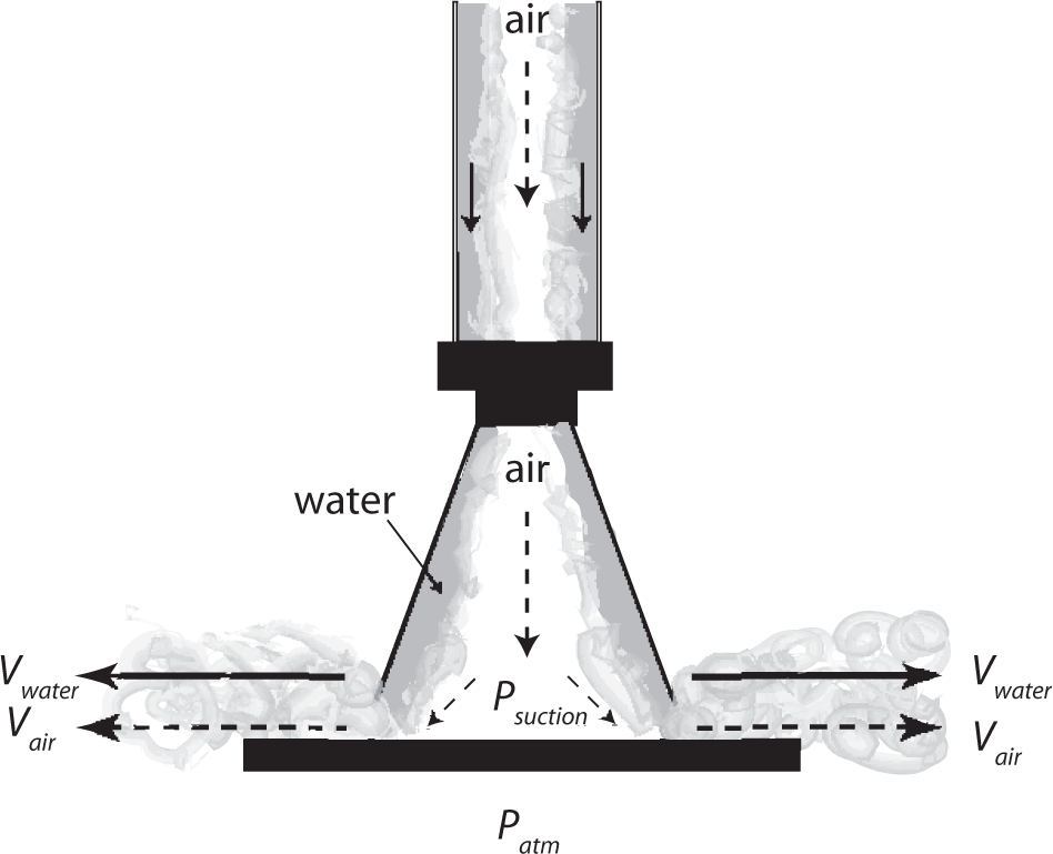 One unexpected result when examining the data collection was that thrust decreased slightly when air was initially injected. As the air flow was increased, this effect disappeared when the flow regime transitioned to slug flow. Thrust decrease was observed for all SFE configurations, with the exception of those that utilized a 25 mm downstream tube. This phenomenon can be explained with the help of the illustration in Figure 13. This figure displays pictorially the effect of water and air flow turning when impinging on the thrust-plate. At lower air flow rates, i.e., 1 L/s ~ 4 L/s (ReA = 1.2×104 ~ 4.9×104), it must exit and turn through the water cone curtain, and a turbulent mixing region develops. In effect, the velocity of the air must increase through the water-thrust-plate boundary. By Bernoulli’s principle this would result in a low pressure zone, where Psuction < Patm, in the turbulent mixing region shown in Figure 13. The pressure below the thrust-plate is atmospheric; therefore, this would cause an upward force on the thrust-plate at lower air flow rates. Further study would be required to fully substantiate this theory. One experiment that could be conducted is to tap a pressure line in the center of the thrust-plate to measure Psuction. If the pressure drops below atmospheric, then this would indicate that the air exiting at lower air flow rates causes this suction effect. A second contributing factor could be due to a change in the momentum balance of the water such that with the injection of air, more momentum is in the horizontal direction, thereby reducing the vertical component of momentum.