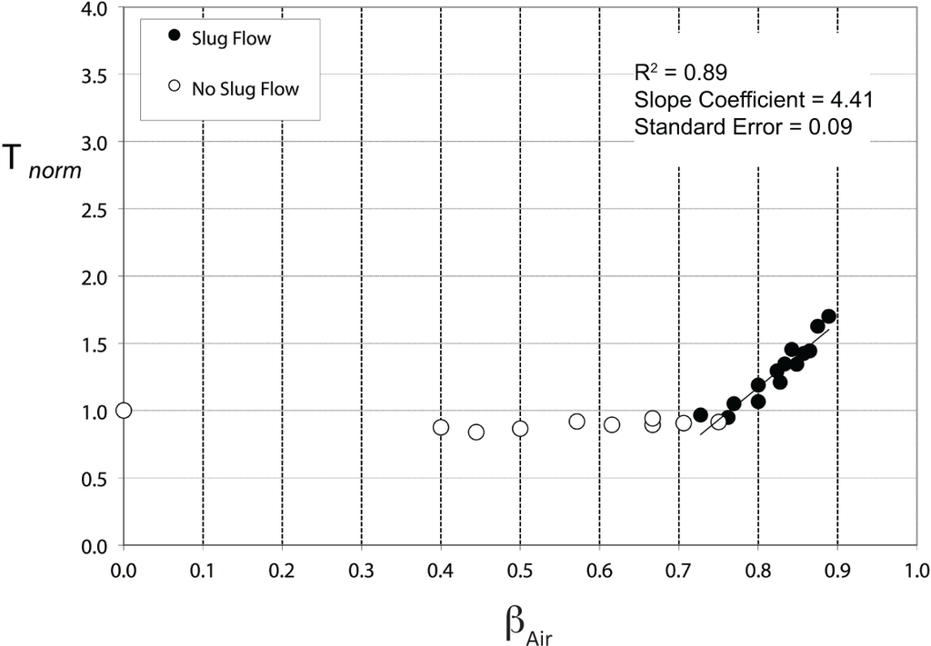 Examining the normalized thrust data is the only valid way of comparing the effectiveness of each SFE geometry. Depending on the SFE geometry, normalized thrust was shown to increase significantly and in an approximately linear manner when slug flow was generated by the SFE. Regression analysis was performed on the normalized thrust data as a function of βAir. Figure 14 displays the line-of-best-fit from the linear regression analysis performed on the normalized thrust data for the SFE L8D8 DST15 configuration. Only normalized thrust data for βAir > 0.75 was considered when performing this linear regression. The magnitude of the slope from the linear regression indicates the propensity of the SFE configuration to augment thrust.