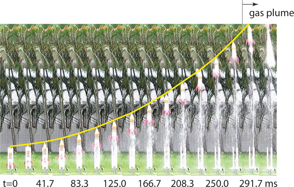 Of note in Figure 2 is the second-to-last frame where the emergence of a gas plume is observed at the bottom of the water rocket. The plume becomes more pronounced in the final image when the rocket is no longer visible in the frame. The emergence of the plume corresponds to the moment when all of the water has been expended from the rocket. Without a water plug to retain the compressed gas, rapid expansion proceeds and entrains residual liquid from the walls of the container, producing the fine mist visible in the last two frames. With this the pressure in the container quickly drops and the compressed gas is no longer able to perform work.