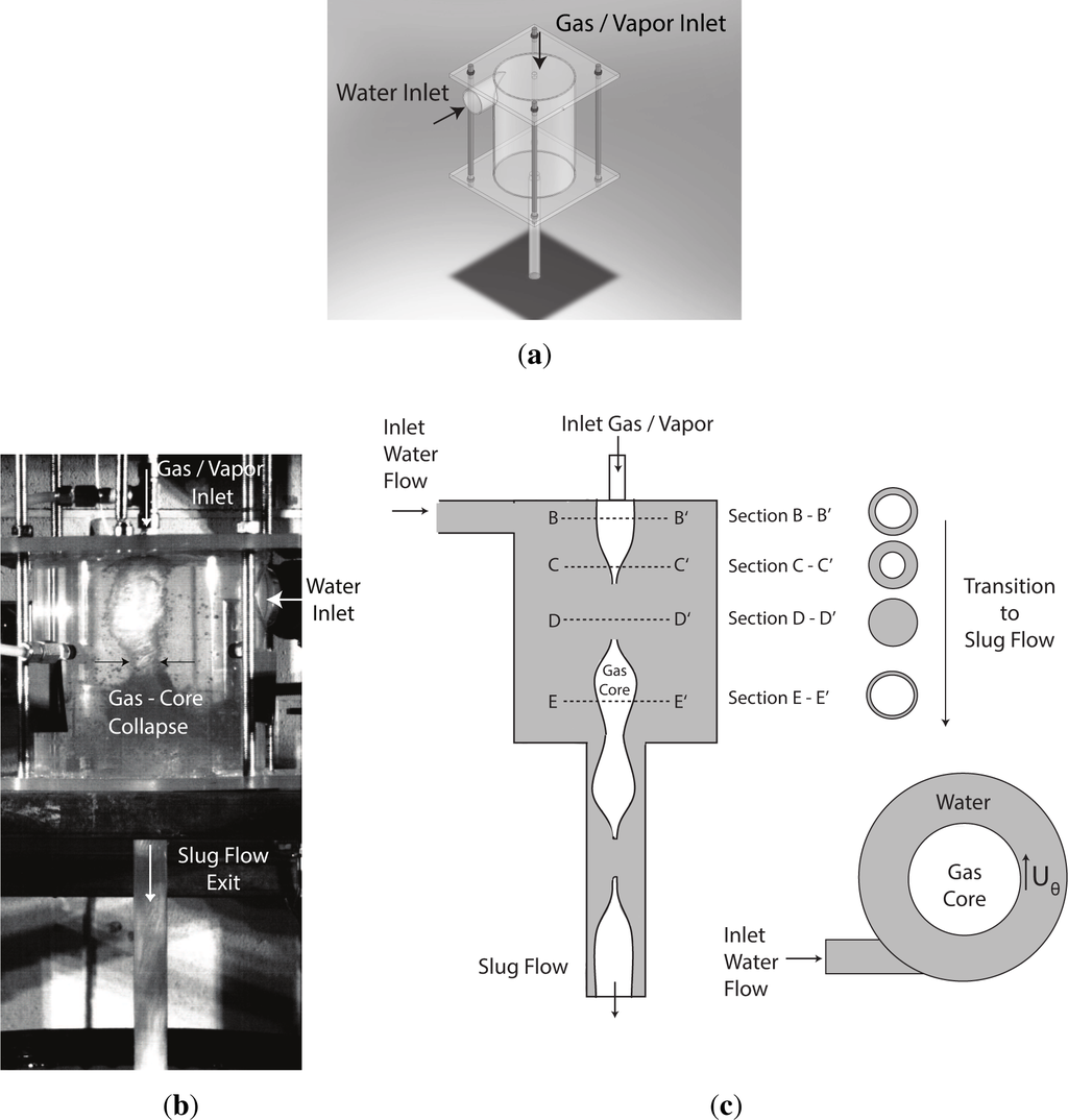 The original motive for this investigation came from an earlier multiphase flow metering investigation by Veer [12] using a geometry similar to that shown in Figure 3a, with the exception that in the earlier investigation the air-water multiphase flow entered through the Water Inlet and the Gas/Vapor Inlet did not exist. In this earlier investigation it was noted that under certain flow conditions the entire experimental apparatus would shake violently. It was speculated that the cause of this vibration was due to slug formation. Further testing confirmed this speculation and also indicated that the propensity for slug flow to develop was increased by injecting air vertically into the SFE, in a separate inlet stream, along the cavity’s central axis as shown in Figure 3b,c. The ability to form repeatable liquid slugs represented an extension to the water rocket concept, only now with the ability to operate in a continuous manner given that both water and gas/vapor are constantly replenished.