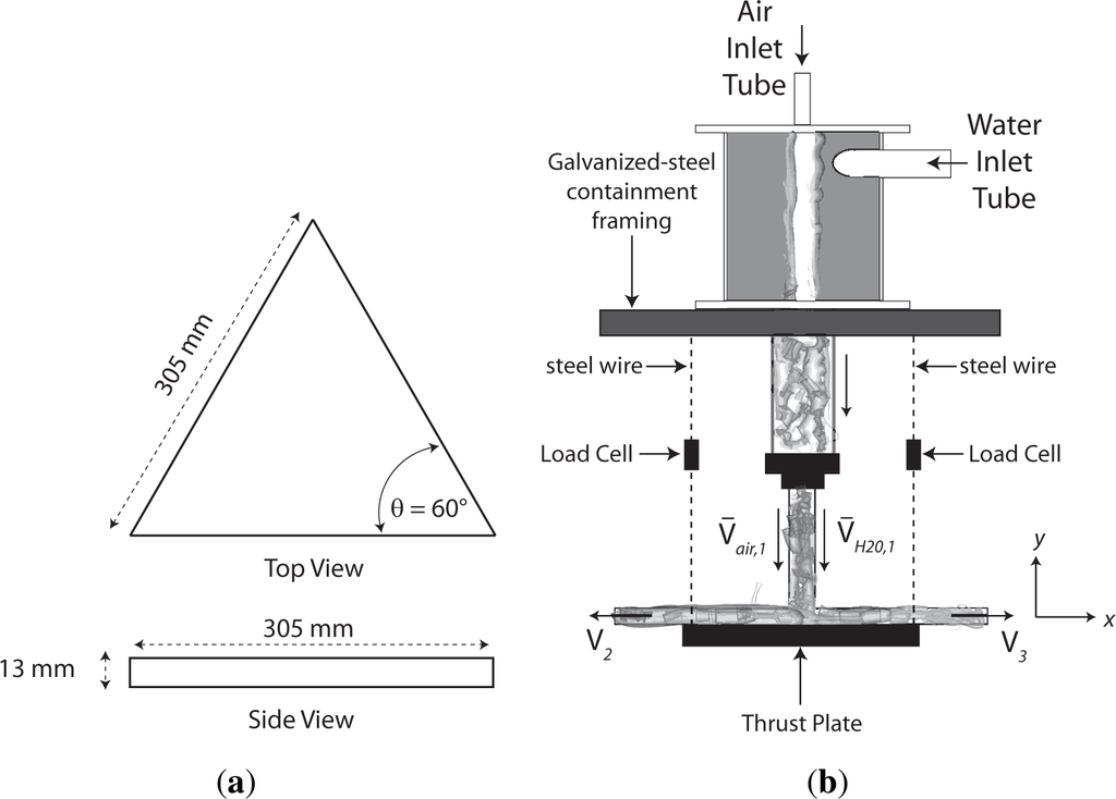 Thrust was measured by conducting experiments where the flow exiting the SFE impinged normal to a triangular aluminum plate, aptly named the “thrust-plate.” A schematic of the thrust-plate is displayed in Figure 7a. The triangular thrust-plate was kept stationary by connecting steel wire at the vertices with the galvanized-steel framing containing the SFE, as shown in Figure 7b. Load cells were also coupled with the steel wire, resulting in the thrust-plate being located 127 mm downstream from the SFE exit. The load cells measured the force, hence momentum, generated by different SFE configurations at varying flow conditions. For each component flow rate of air and water 60 s of thrust data (sampled at 1 kHz) was collected. The mean thrust for each data set was computed and signified the average thrust exerted on the thrust-plate for each component flow rate.